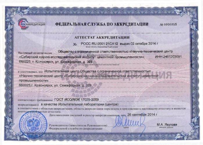 Испытательный центр аккредитован Федеральной службой по аккредитации на проведение испытаний строительной продукции согласно области аккредитации.